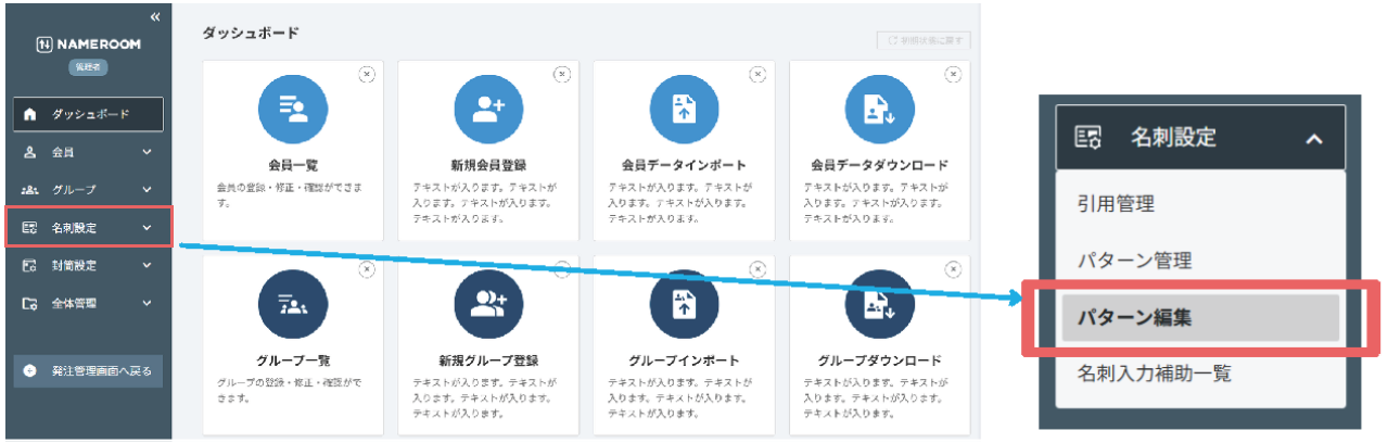 「管理コンソール」の画面から「名刺設定」を選択 → 「パターン編集」から作業を開始してください。