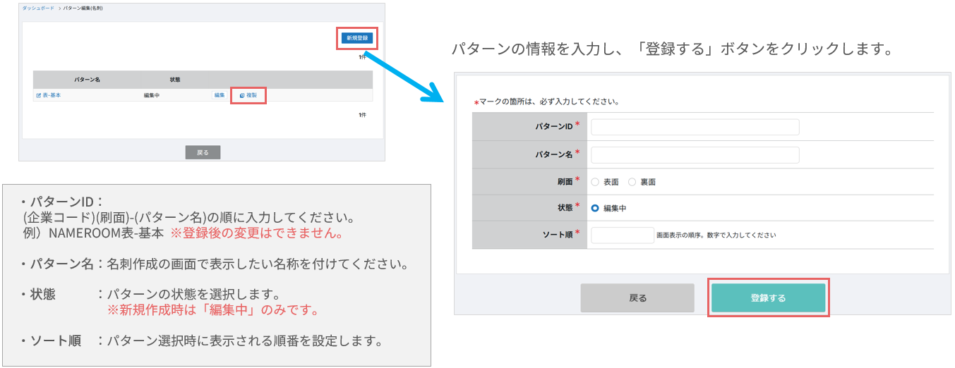 ※登録済みのパターンを複製する場合「複製」ボタンをクリックします。