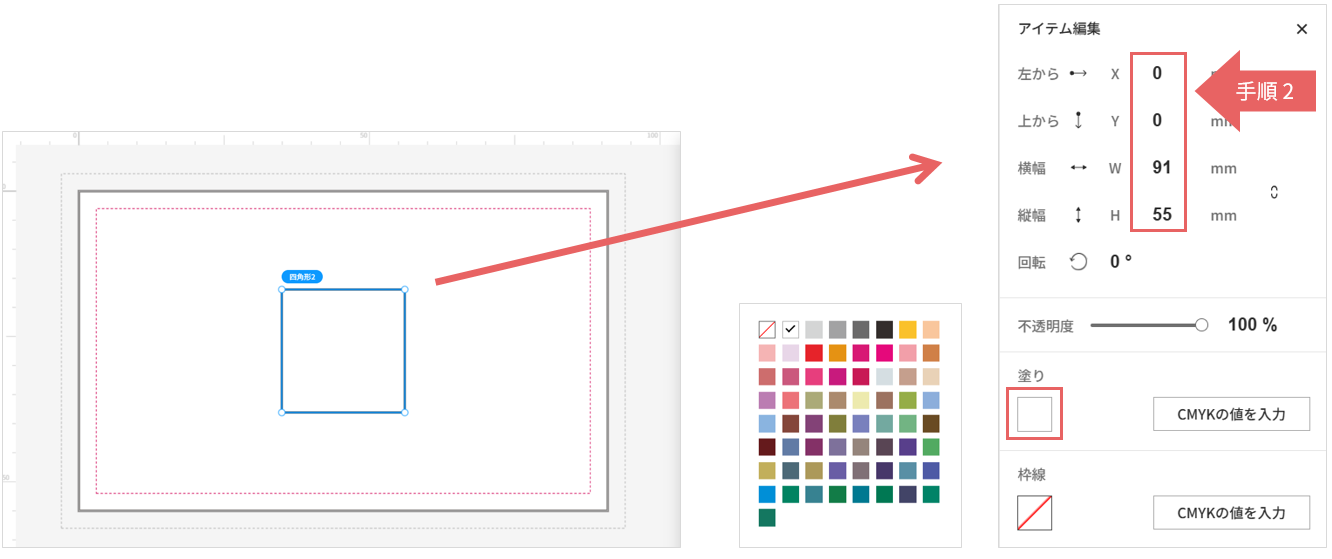 「塗り」はデザインに合わせてカラーチャートから選択、もしくはCMYKの数値を入力してください。