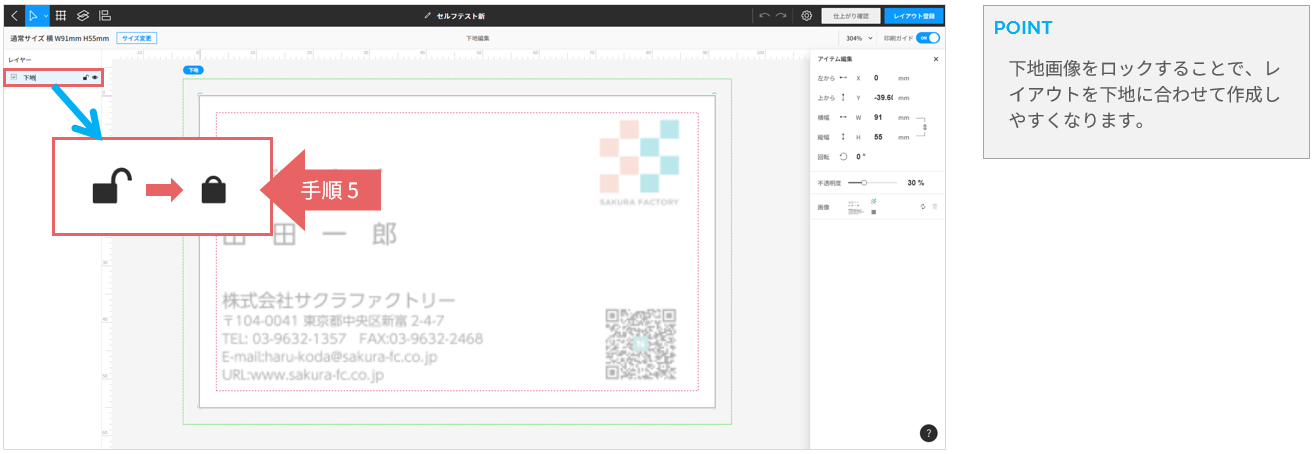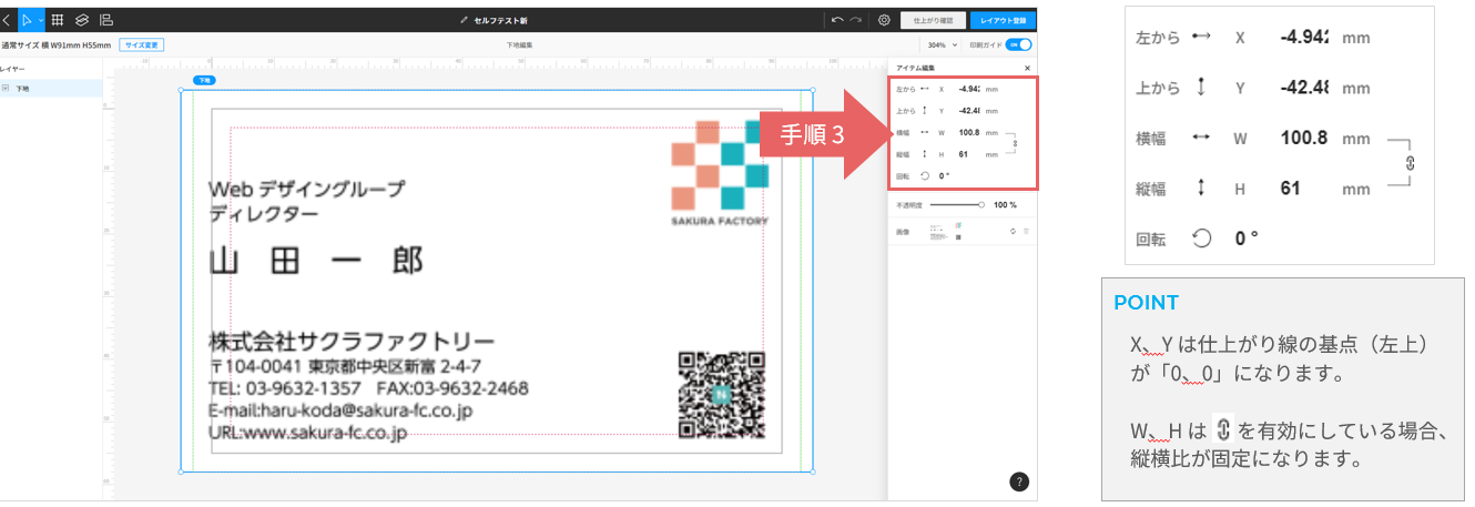 右側のアイテム編集エリアで画像の大きさ、位置を数値入力して「仕上がり線」に合わせて調整します。