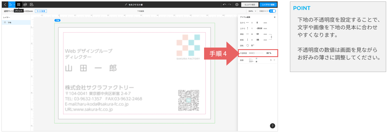 アイテム編集エリアで「不透明度」を調整します。