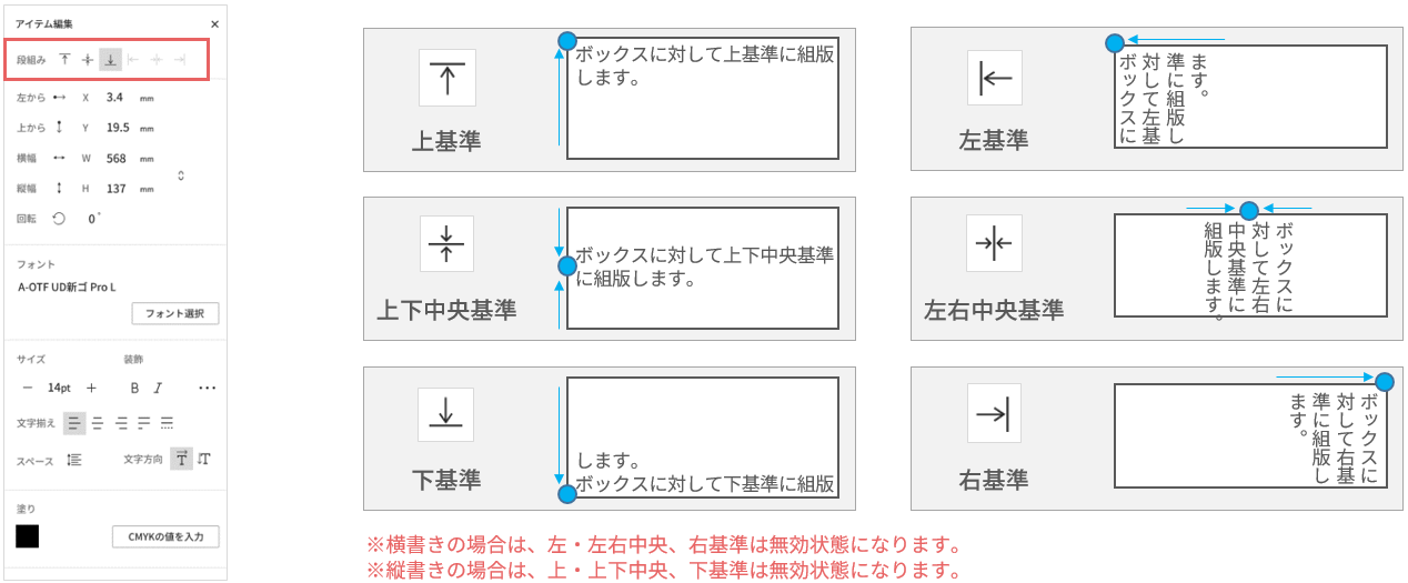 組版ボックス内のテキストの文字揃えを調整します。