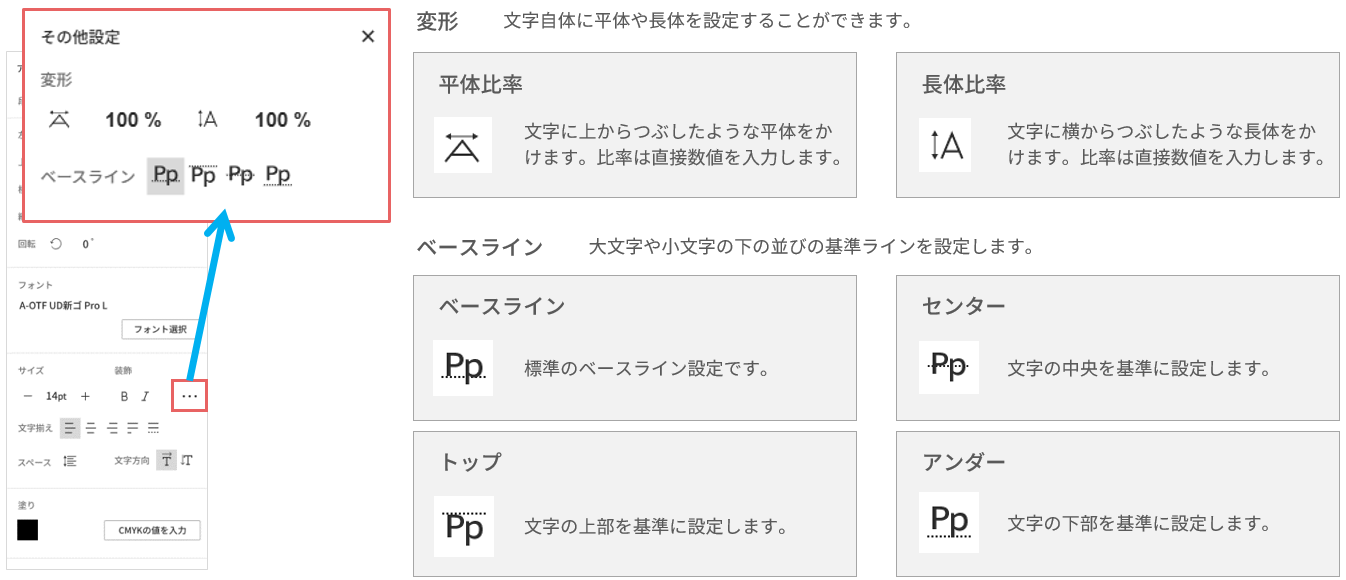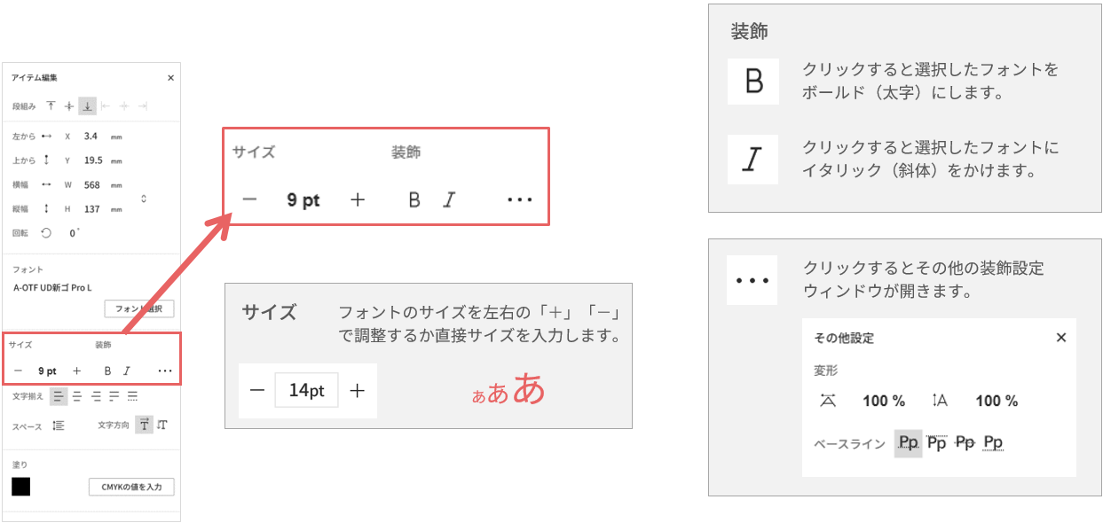 組版ボックス内のフォントのサイズや文字のスタイルを調整します。