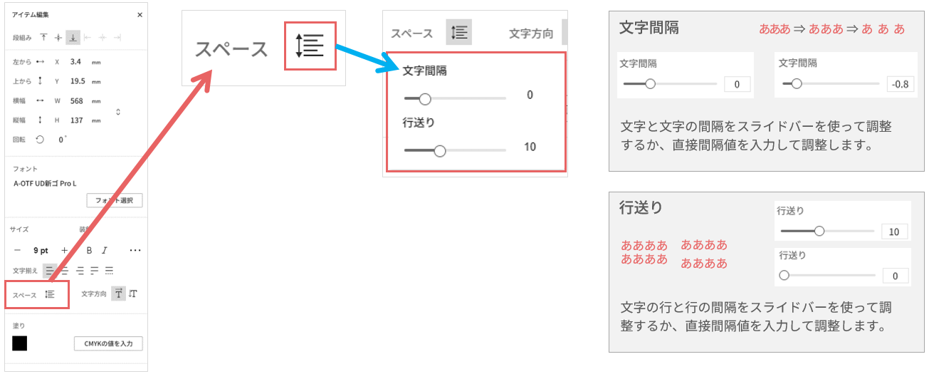 組版ボックス内のテキストの文字間隔と行送りを調整します。
