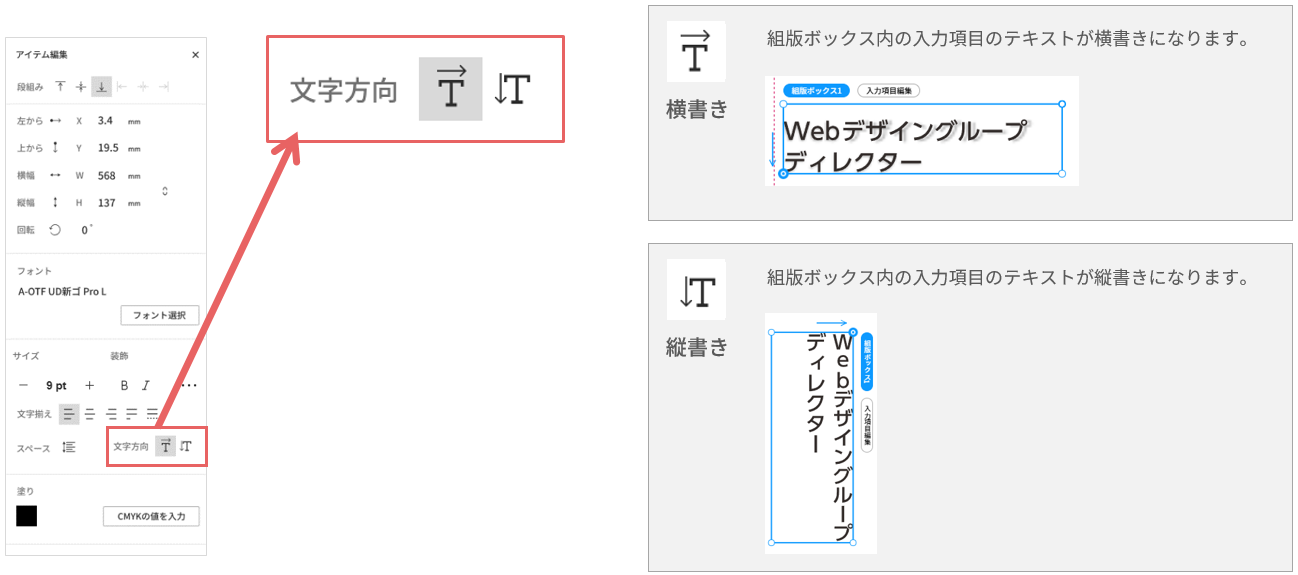 組版ボックス内のテキストの文字方向を選択します。