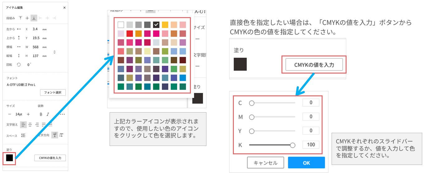 組版ボックス内のテキストの色を変更する場合は、「塗り」の色アイコンをクリックします。