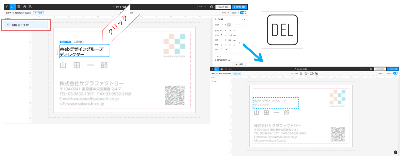 組版ボックスを削除する場合は、組版ボックスをクリックし有効化された状態で「Delete」キーを押してください。
