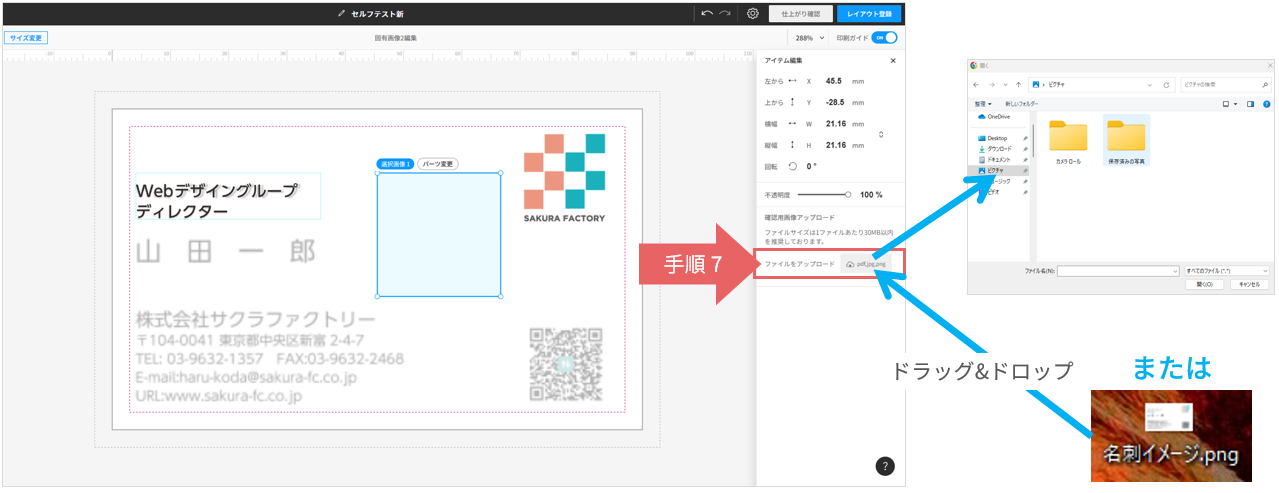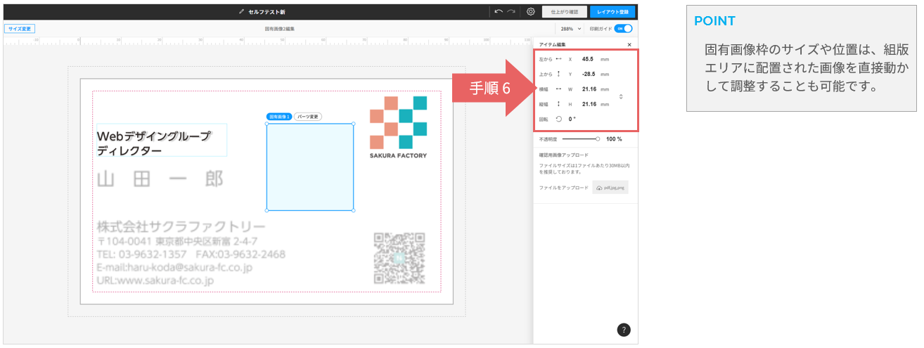 アイテム編集エリアから固有画像枠のサイズや位置を調整します。