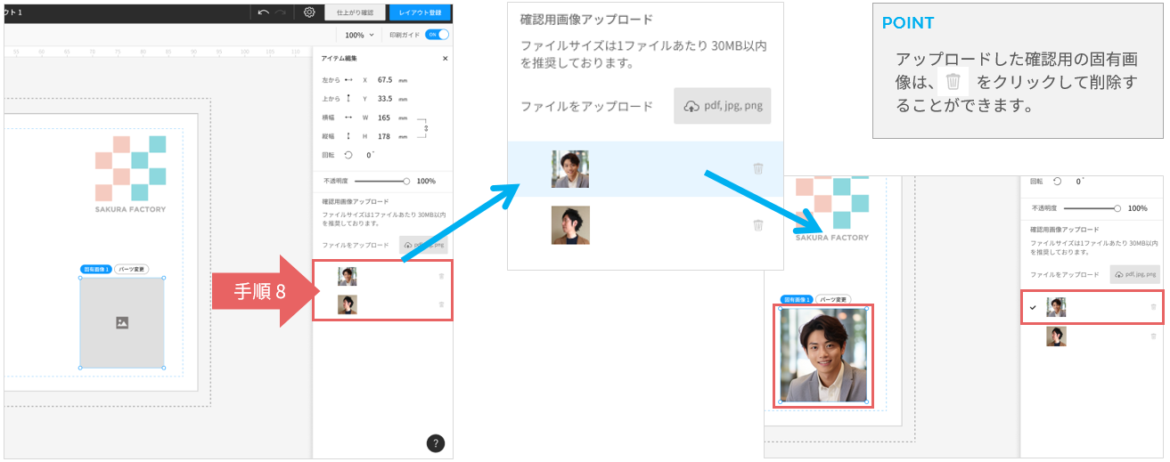 アップロードした確認用の固有画像の中から、組版画面に表示する画像を選択します。