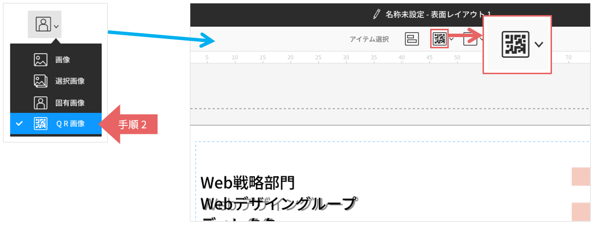 ヘッダーのアイテム選択から切り替えた「QR画像」アイコンをクリックします。