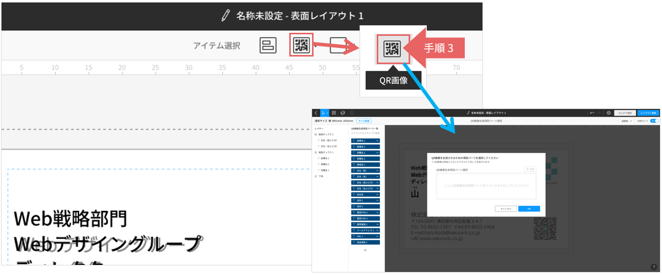 QR画像エリアを追加し、QR画像を生成させるための項目パーツをセットします。