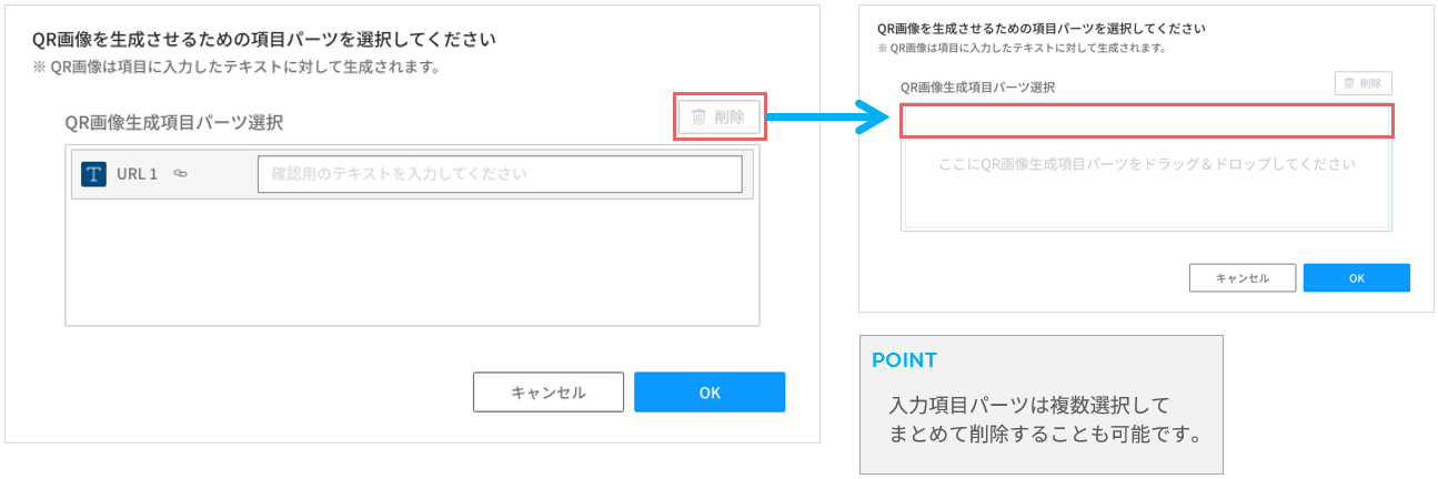 QR画像を自動生成するためのQR画像生成項目パーツを一覧から選択し、パーツ選択エリアにドラッグ&ドロップします。
