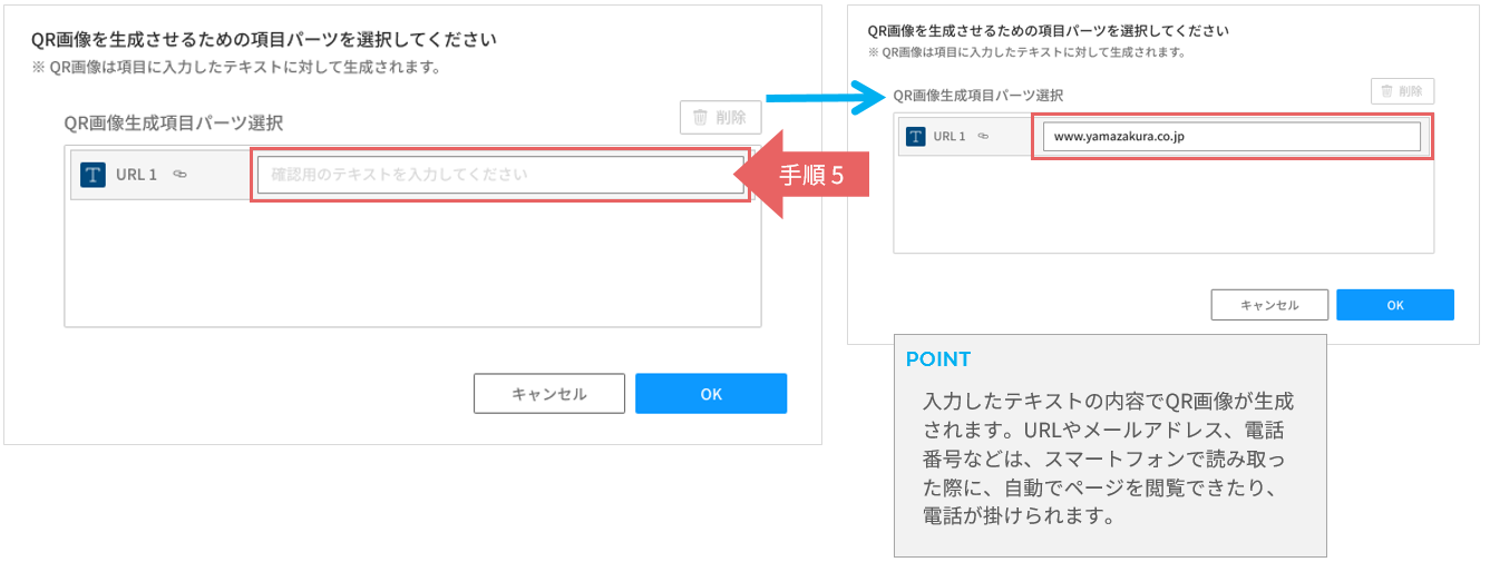 QR画像生成項目パーツの確認用テキスト入力欄にテキストを入力し、QR画像が生成されるか確認します。