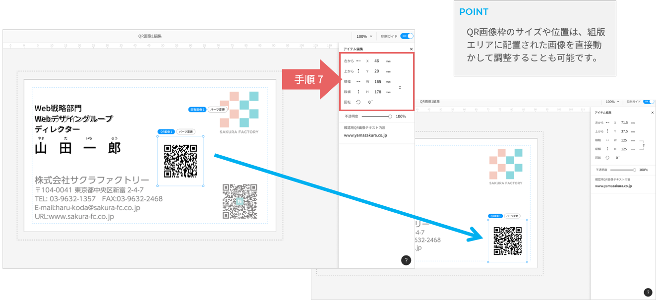 アイテム編集エリアからQR画像枠のサイズや位置を調整します。