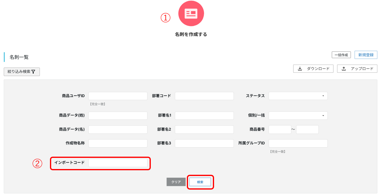 ※事前に山櫻にてインポートコードを付与して名刺データのアップロードを行います。 その後、インポートコードをメールにてお知らせしますので、お客様の方でご発注作業をお願いいたします。 ①ホーム画面の「名刺を作成する」アイコンをクリックします。 ②「インポートコード」に山櫻よりあらかじめお知らせしているインポートコードを入力のうえ、「検索する」をクリックします。