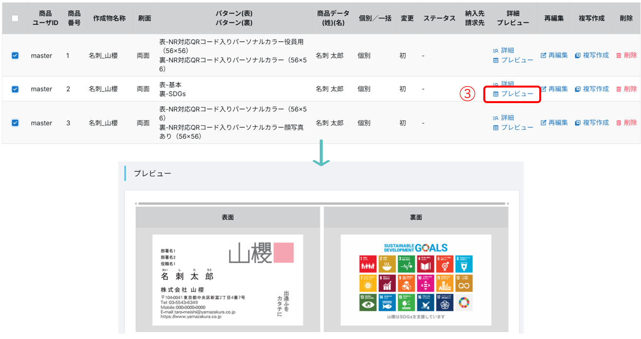 ③検索結果が表示されますので、各名刺の「プレビュー」をクリックし、データの内容を確認します。