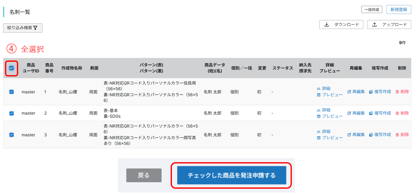 ④一覧画面の「全選択」をクリックしたあと、「チェックした商品を発注申請する」をクリックします。