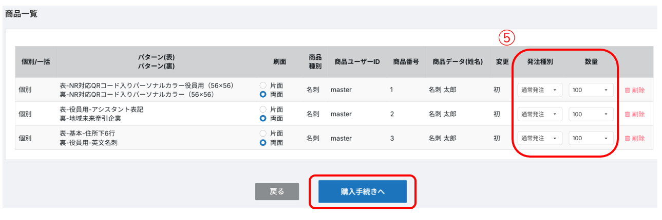 ⑤商品一覧の画面が表示されますので、発送種別と数量を適宜プルダウンで変更し、「購入手続きへ」をクリックします。