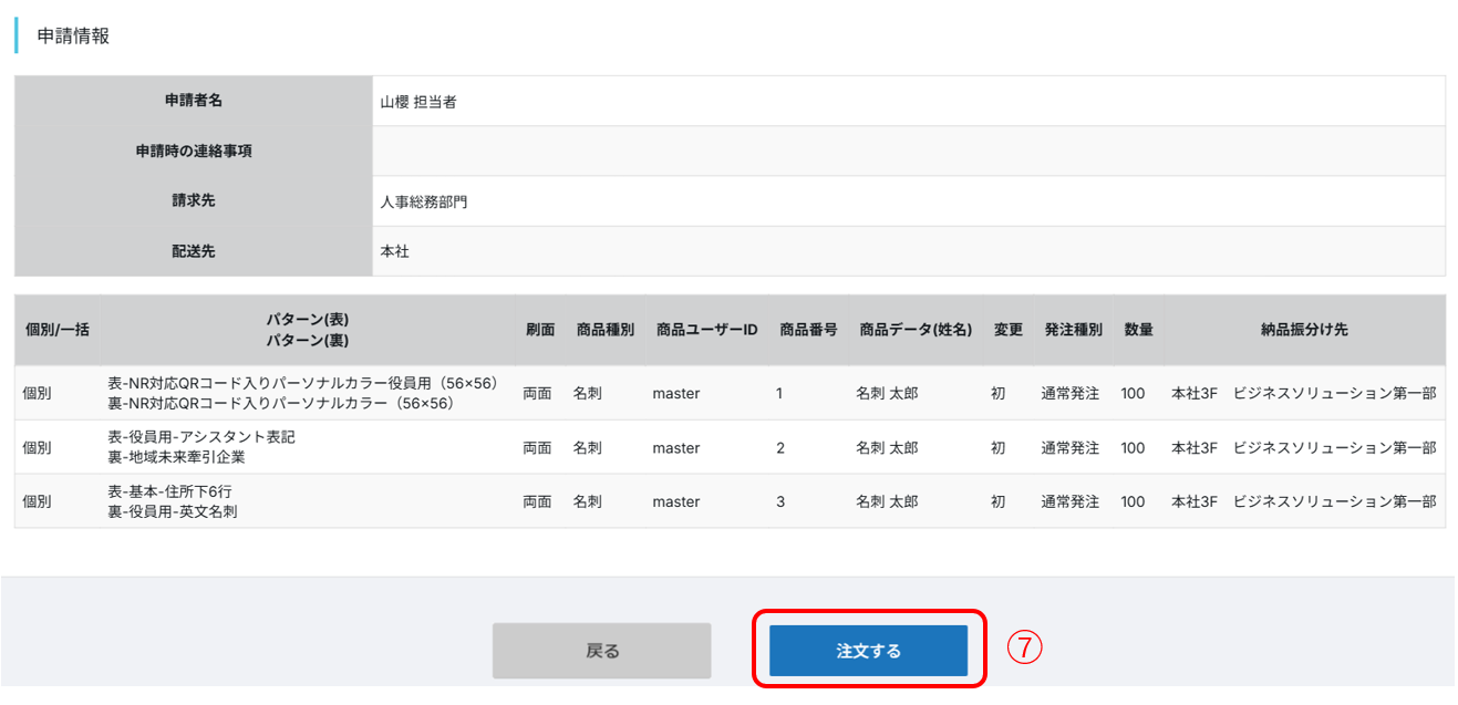 ⑦発注申請確認の画面が表示されますので、内容を確認のうえ、「注文する」をクリックします。