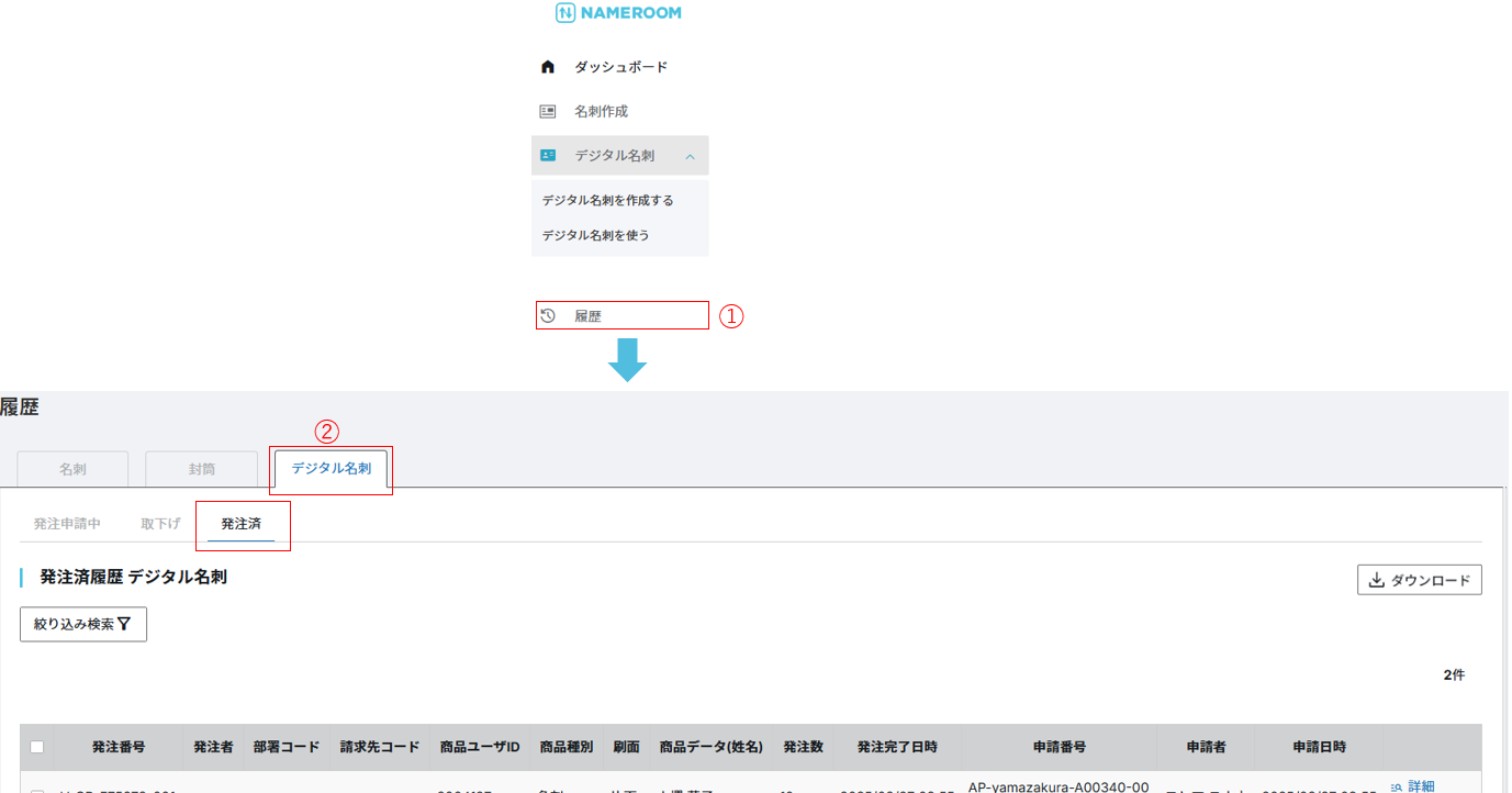 デジタル名刺の発注履歴を確認するデジタル名刺の発注履歴の確認手順①ホーム画面の「発注履歴を見る」をクリックします。 ②発注済の画面が表示されますので、「デジタル名刺」のタブをクリックすると、発注履歴が確認できます。関連コンテンツデジタル名刺を新規作成するデジタル名刺を再編集するデジタル名刺を発注するデジタル名刺を使う