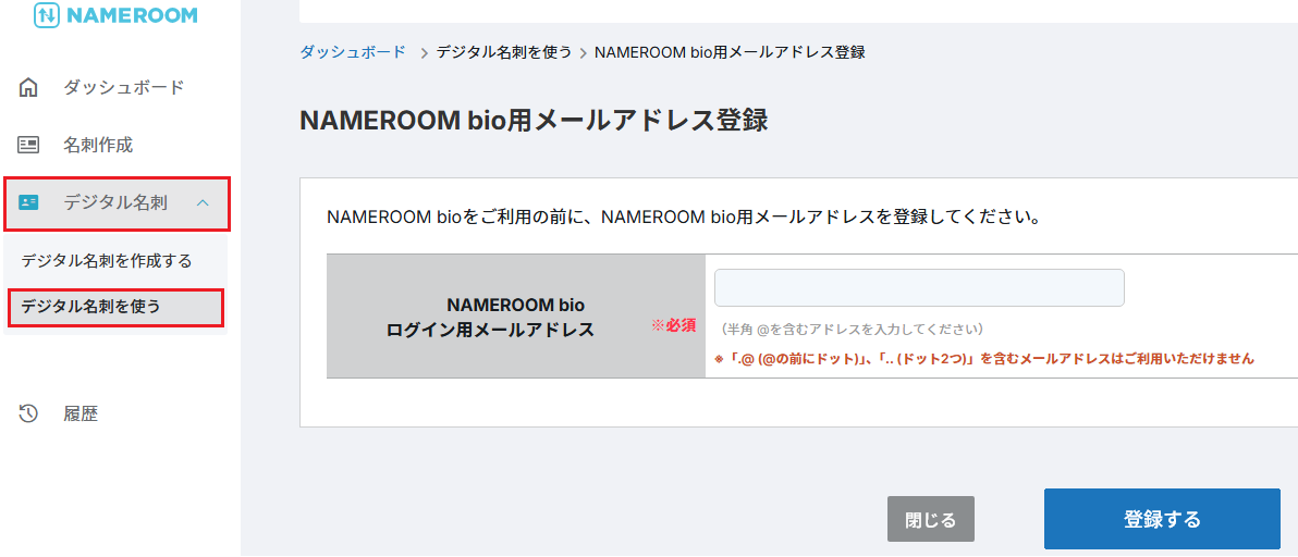 デジタル名刺を作成していない方は、ホーム画面の「デジタル名刺を使う」をクリックすると、 NAME ROOMBbio用のメールアドレスの登録画面が表示されます。
