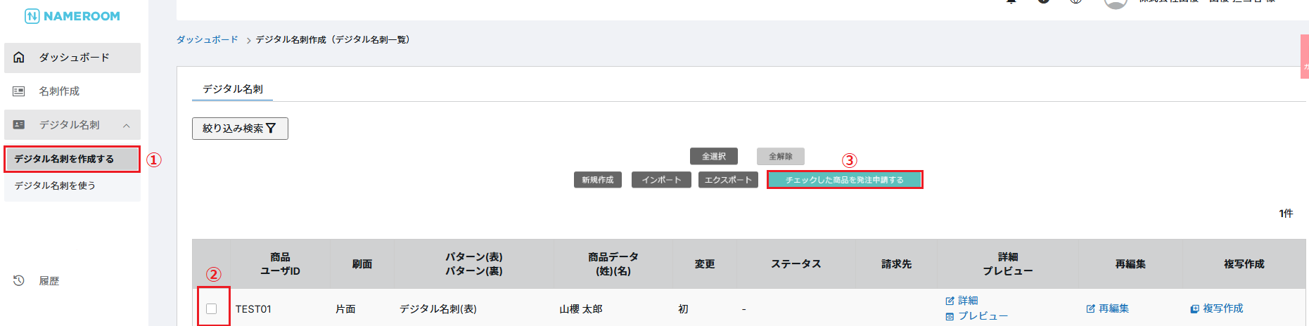 ①ホーム画面の「デジタル名刺を作成する」をクリックします。 ②作成済のデジタル名刺の情報が表示されますので、発注したいデジタル名刺の 左側のチェックボックスにチェックを入れます。 ③「チェックした商品を発注申請する」をクリックします。