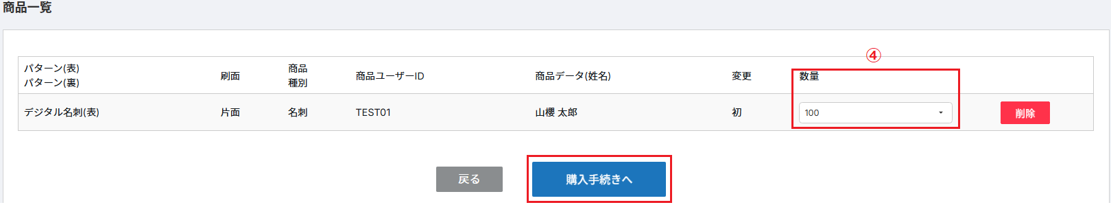 ④商品一覧の画面が表示されますので、数量をプルダウンで選択し、「購入手続きへ」をクリックします。