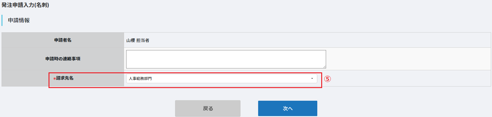 ⑤発注申請入力(デジタル名刺)の画面が表示されますので、請求先を選択し、「次へ」をクリックします。