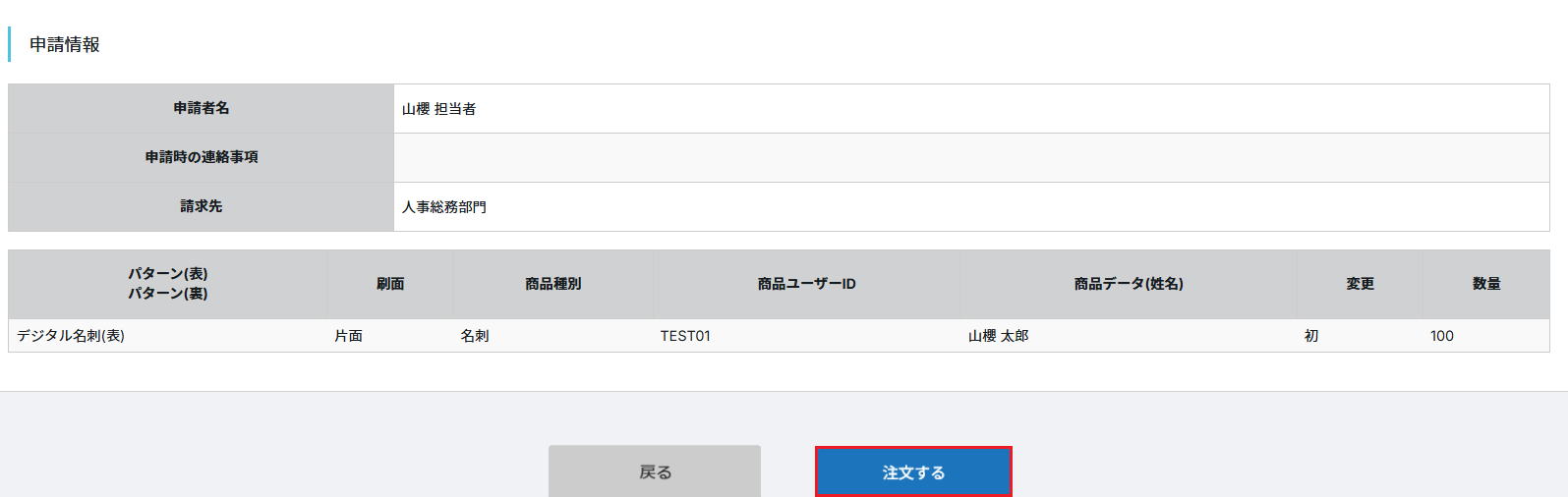 ⑥発注申請確認の画面が表示されますので、内容を確認のうえ、「注文する」をクリックします。