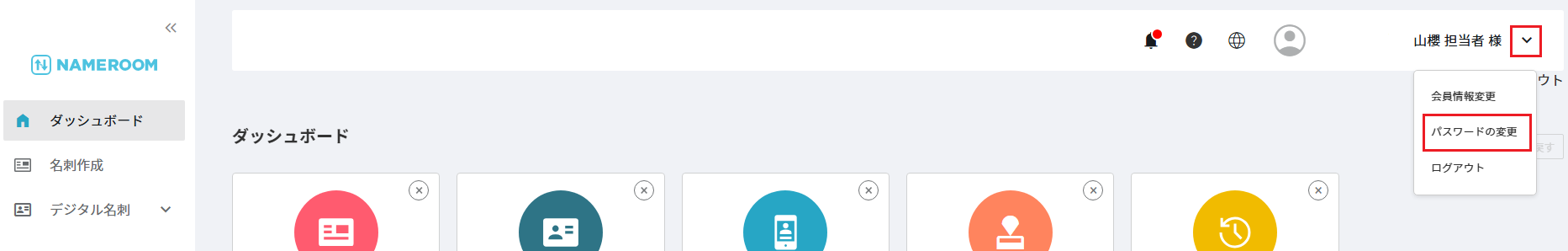 ①画面右上のログインユーザー名横の「▼」をクリックすると「パスワードの変更」のメニューが表示されます。