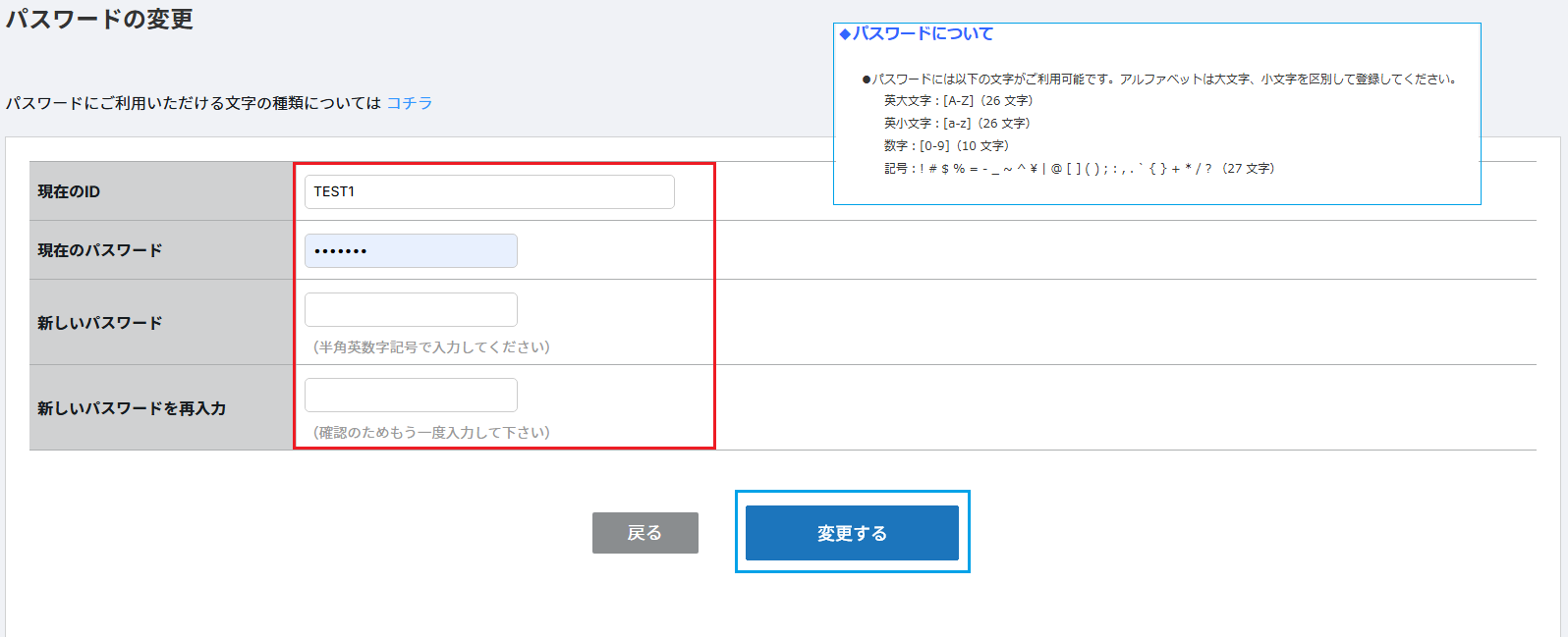 ②パスワード変更の画面が表示されますので、すべての項目を入力し、 「変更する」をクリックします。