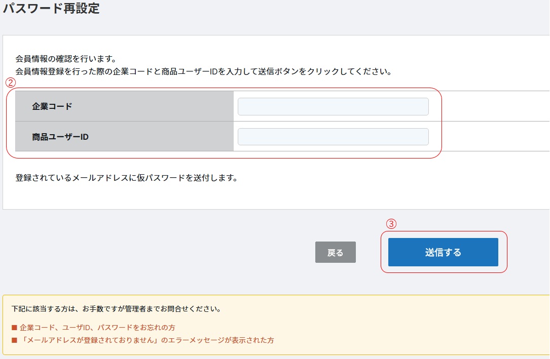 ②パスワード再設定の画面が表示されますので、企業コードと商品ユーザーIDを入力します。※企業コードと商品ユーザーIDがわからない場合は、貴社名刺管理者の方へお問い合わせください。