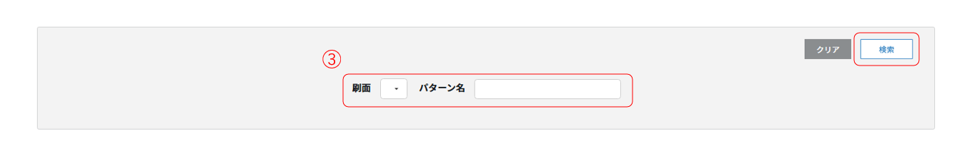 ①ホーム画面の「管理メニューを見る」アイコンをクリックします。 ②「パターン管理(名刺)」をクリックします。 ③パターン一覧(名刺)の画面が表示されますので、「刷面」「パターン名」を入力し、 「検索する」をクリックします。 ※「刷面」「パターン名」を入力しない場合は、全件表示されます。
