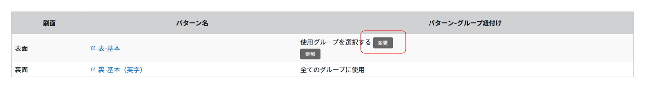 ④名刺レイアウトとの紐付けを変更するグループの「変更」をクリックします。