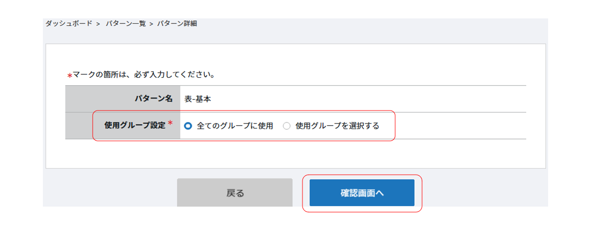 ⑤パターン詳細の画面が表示されますので、「使用グループ設定」のどちらかを選択し、 「確認画面へ」をクリックします。