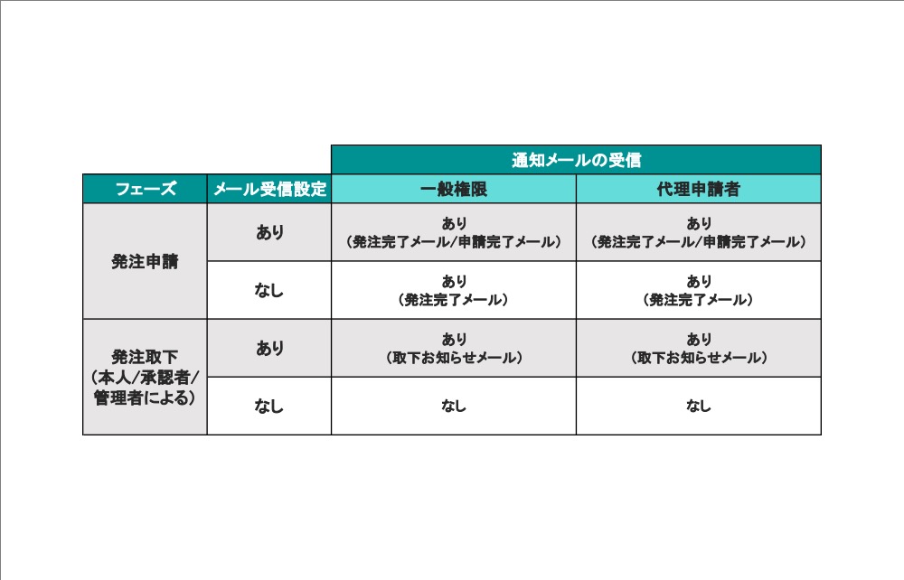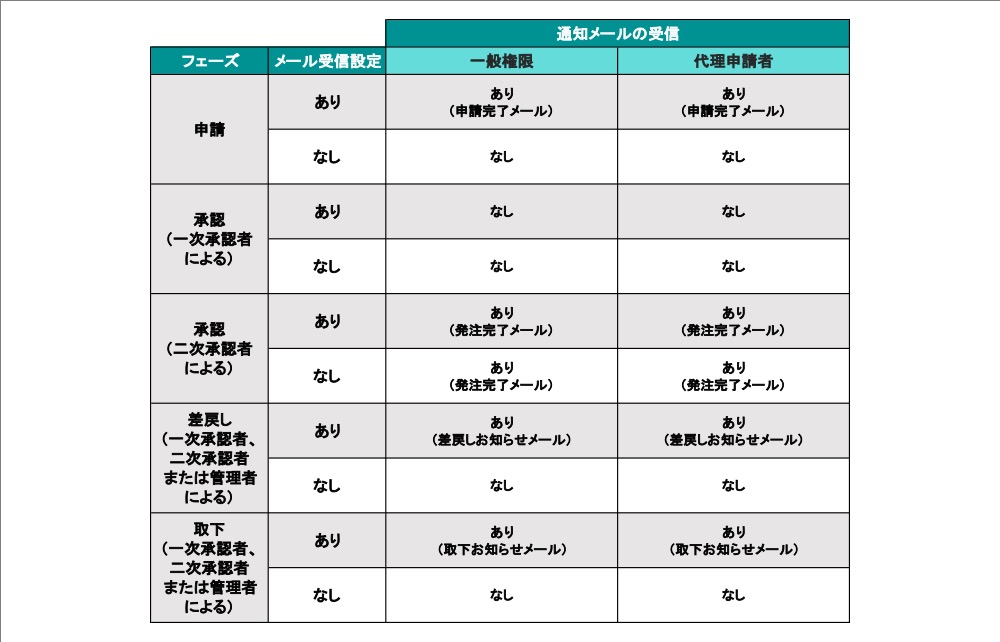 各権限や、受信設定状況について申請時などのお知らせメールの受信の有無が異なります。 一覧をご確認の上、必要に応じて設定を行ってください。 ※一部、受信設定を「なし」にした場合でも届くメールがございます。