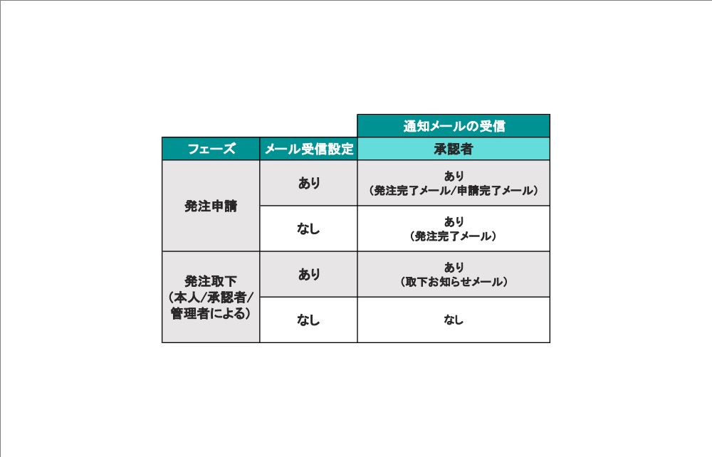 各権限や、受信設定状況について申請時などのお知らせメールの受信の有無が異なります。 一覧をご確認の上、必要に応じて設定を行ってください。 ※一部、受信設定を「なし」にした場合でも届くメールがございます。