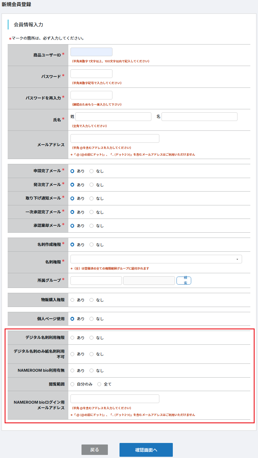 会員情報画面で「デジタル名刺利用権限」以下 4項目が追加になっているため
