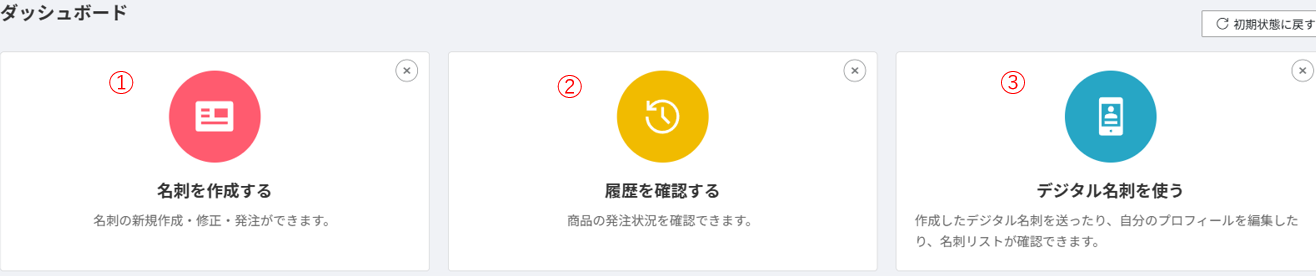 一般権限のホーム画面について一般権限のホーム画面と各機能について説明します。メニューアイコンについて①「名刺を作成する」名刺の新規作成、編集作業を行います。②「履歴を確認する」申請をした名刺の承認状況やこれまで発注した名刺の履歴が確認できます。③「デジタル名刺を使う」作成したデジタル名刺を送ったり、自分のプロフィールを編集したり、名刺リストが確認できます。関連コンテンツ権限と主な機能一覧についてMENUボタンについて