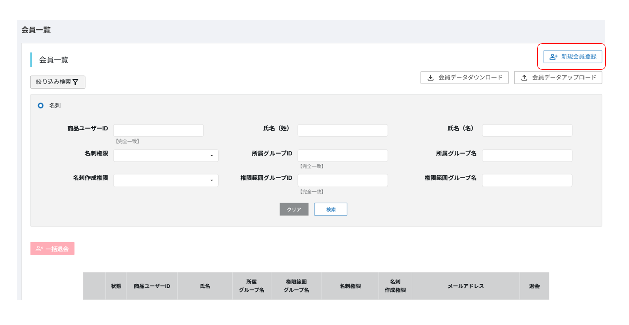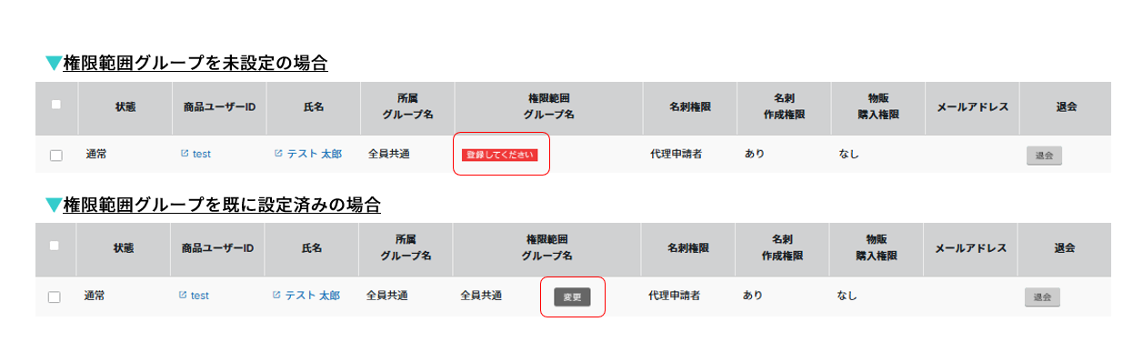 対象の会員を検索し、「権限範囲グループ」欄に表示されている「登録してください」または「変更」をクリック。