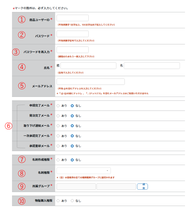 ※ご契約内容や権限の種類によって、表示される項目の仕様が異なる場合があります。貴社の規定に沿って入力してください。 ※記号の 「.」(ピリオド)「;」(セミコロン)「“」(ダブルクォーテーション)は使用できません。 ※「申請完了メール」「発注完了メール」「取り下げ通知メール」「一時承認完了メール」「承認棄却メール」を受信する場合は「あり」を選択してください。 ※「名刺作成権限」を「なし」にチェックを入れると、新規登録した会員のホーム画面に「名刺を作成する」のアイコンが非表示となり、会員の方ご本人が、名刺の作成や発注申請を行うことができなくなります。 ※「名刺権限」は自身の権限より上の権限を選択することはできません。「一般」以外の権限を選択した場合、「一括作成リスト」項目が追加されます。サイト構築時の設定に合わせてチェックを入れてください。