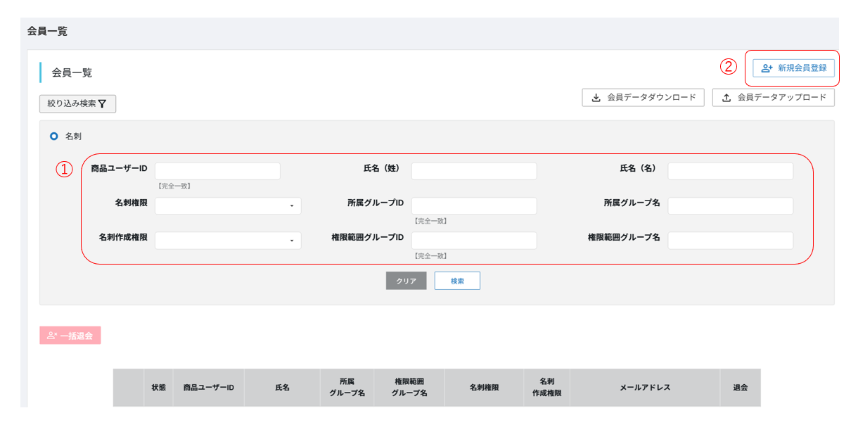 会員一覧について会員一覧の画面と各機能について説明します。画面説明①各項目会員を検索する際の条件入力をします。②「新規登録」(※詳細は「会員を新規登録する」を参照)会員の新規登録ができます。関連コンテンツ会員を新規登録する会員情報を修正する会員情報を削除する会員データをアップロードする会員データをエクスポートする