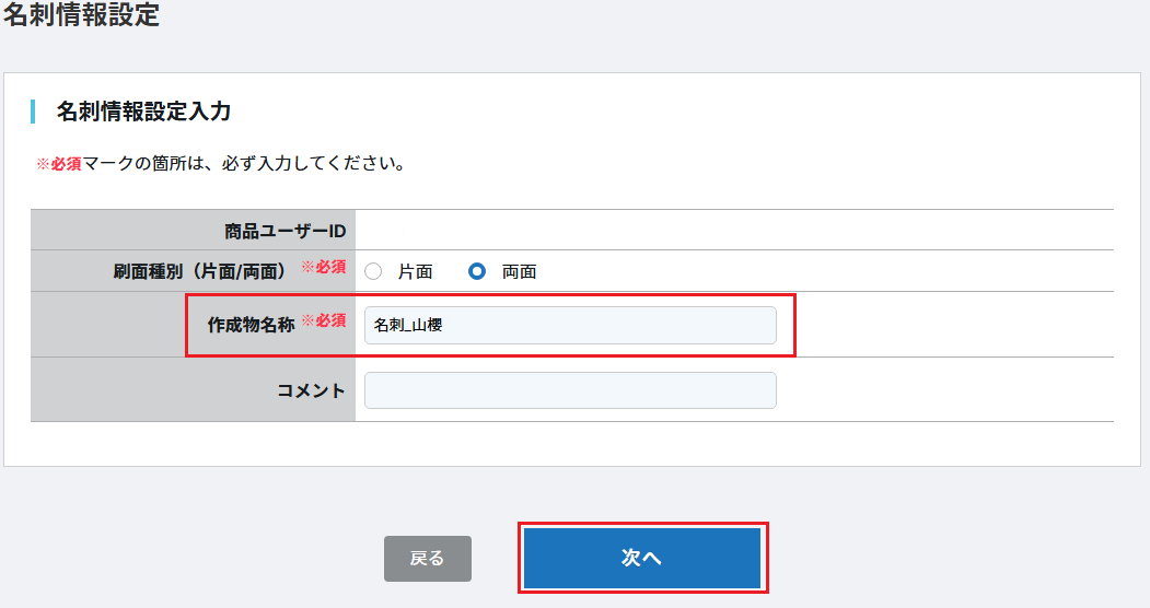 作成物名称変更する作成物名称変更方法①名刺編集画面の「刷面等を変更する」アイコンをクリックします。②下記の画面が表示されますので、「作成物名称」の修正が可能となります。③次へをクリックすると名刺編集画面へ戻りますのでこちらで保存をクリック。