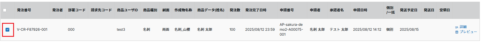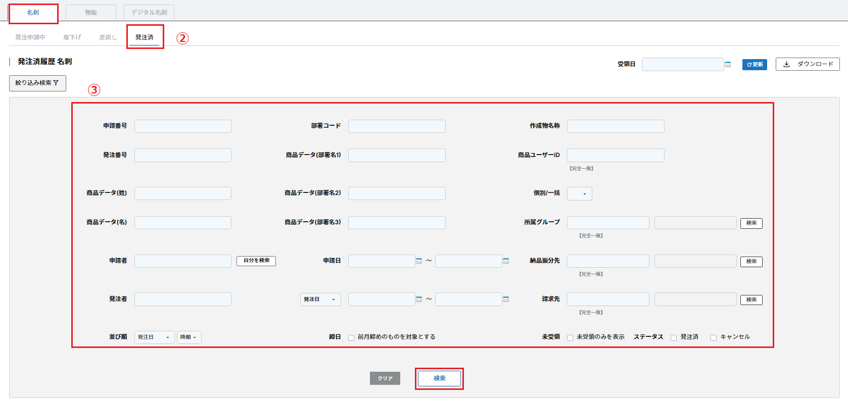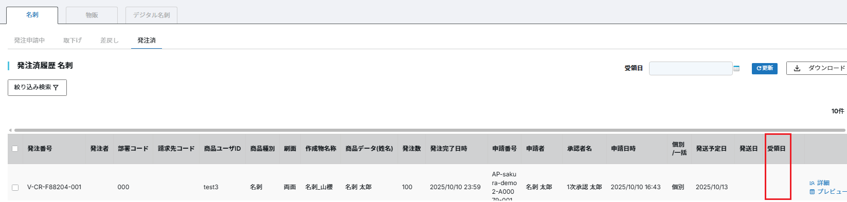 発注済履歴の左端に表示されている「受領日」という項目は、 下図のとおり空欄が標準の状態です。 必要に応じて、手動で受領日を更新し日付を表示させてください。 ※受領日は名刺の種類や設定されている権限を問わず、すべての方が更新できる項目です。 自身で発注申請した名刺以外の受領日を更新することも可能なため、 操作を行われる際は十分にご注意ください。