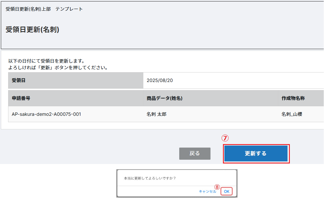 ⑦受領日更新の画面が表示されますので、内容を確認の上、「更新」をクリックします。 ⑧「本当に更新してよろしいですか?」のポップアップが表示されますので、 「OK」をクリックします。