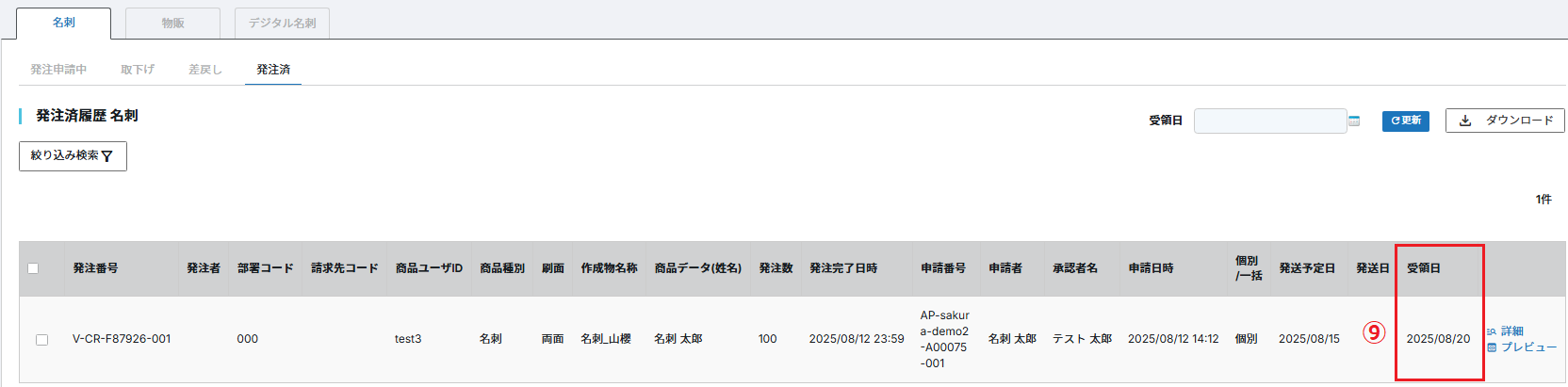 ⑨発注済履歴の画面に切り替わり、受領日に指定の年月日が表示されましたら 受領日の更新は完了です。