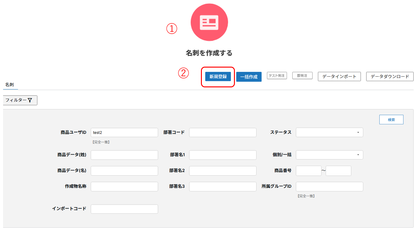 ユーザーIDに設定されている権限によって、下記のとおり1つのユーザーIDにつき 最大10個の名刺を作成できます。 ・一般/代理申請者/承認者の方:5個 ・管理者の方:10個 作成できる個数の範囲内で、未登録の商品番号に変更することも可能です。 自動入力の場合、未登録の商品番号の中から小さい数字順に番号が割り振られます。