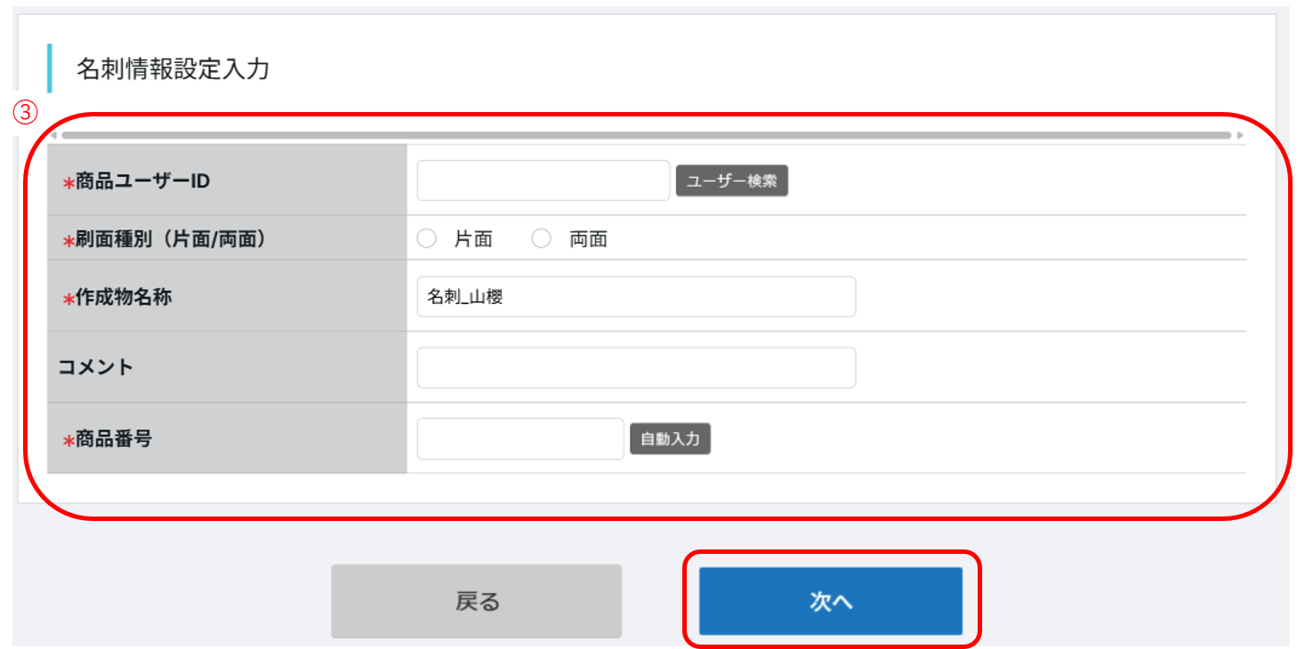 ③商品情報入力の画面が表示されますので、「必須」と表示されている項目をすべて入力し、「次へ」をクリックします。 ※商品ユーザーIDは一般権限の方は表示されない項目です。 ※作成物名称はあらかじめ「名刺_ユーザー名」と自動入力されております。 ※コメントは任意でコメントを残すことができます。 山櫻側、および印刷会社や工場側では内容を確認することができません。 ※商品番号は作成する名刺をNAMEROOMのサイト上で管理しやすいように、番号を振ってください。