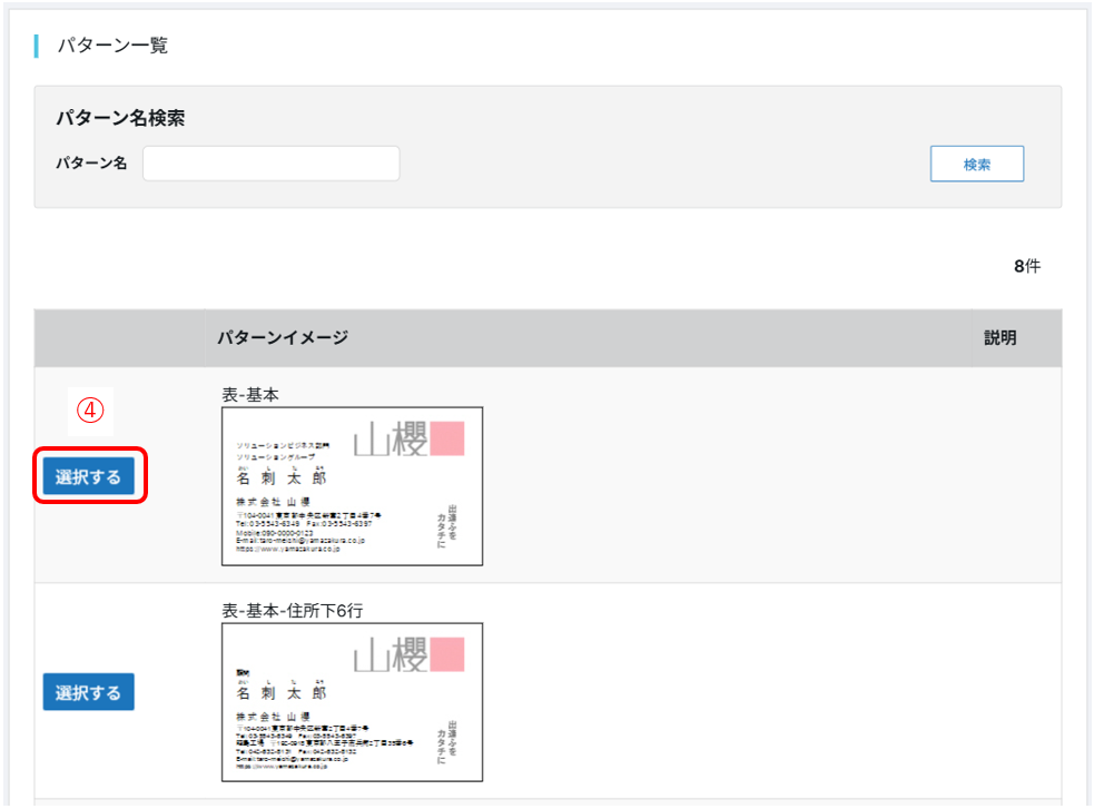 下記の画面の「表-基本」と表示されている部分がパターン名です。 ※刷面種別【両面】にチェックを入れた場合 はじめに「表面」のレイアウトを選択後、画面が切り替わりましたら、 続けて「裏面」のレイアウトを選択します。 「表面」と「裏面」の両方のレイアウトを選択完了後に⑤の画面へ遷移します。