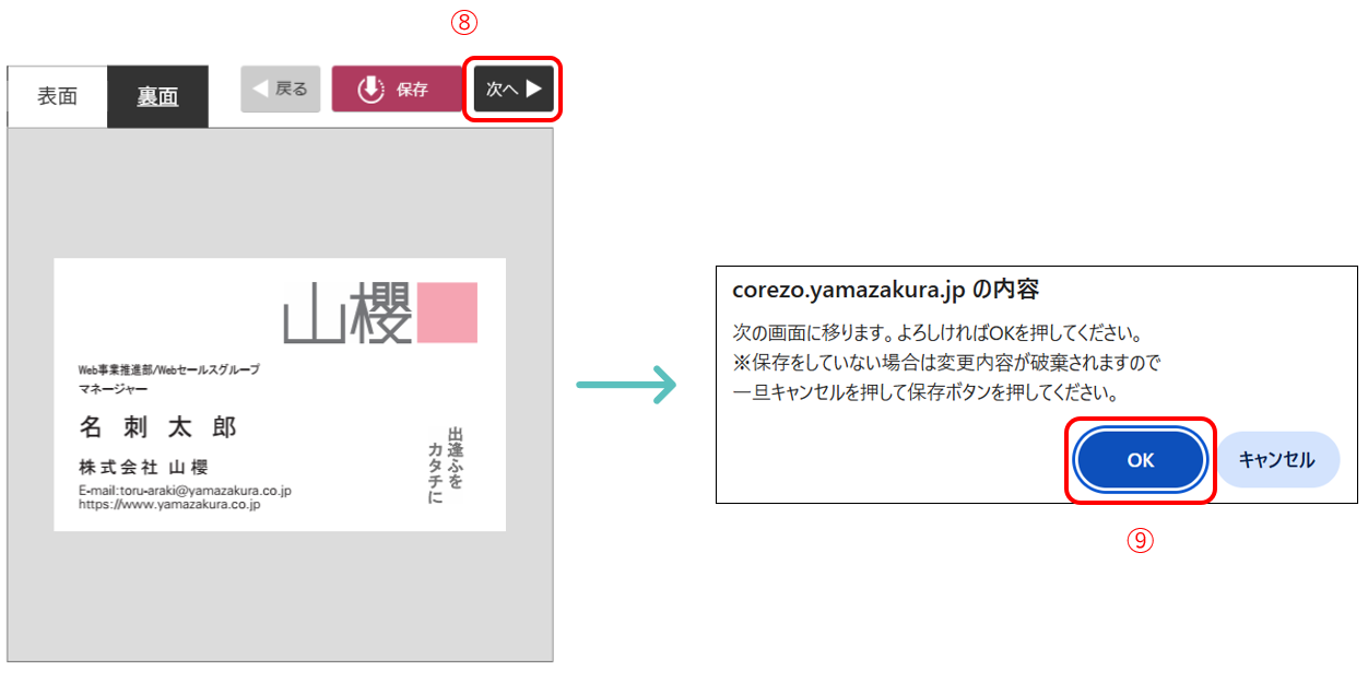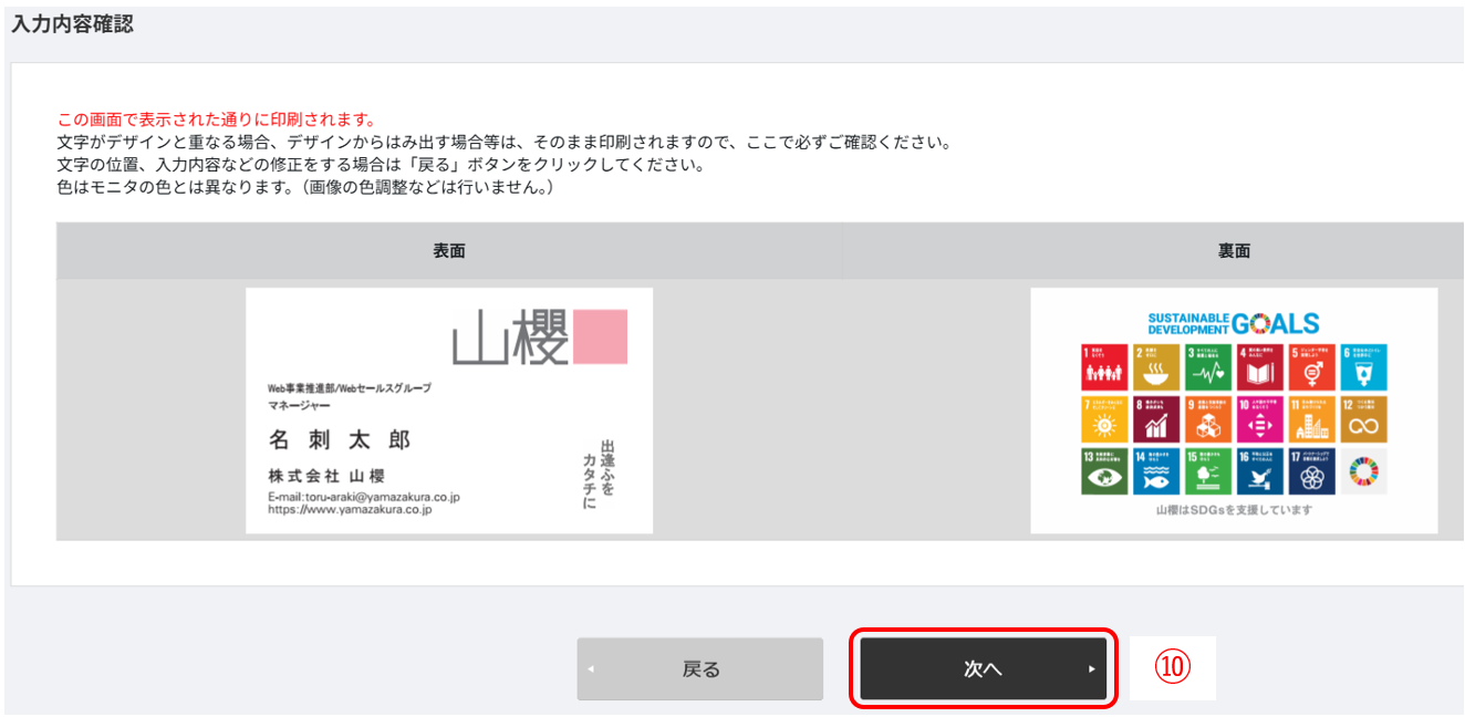 ⑩編集内容の確認の画面が表示されますので、名刺の内容を確認の上、 「次へ」をクリックします。